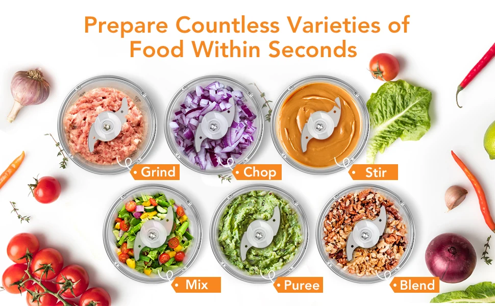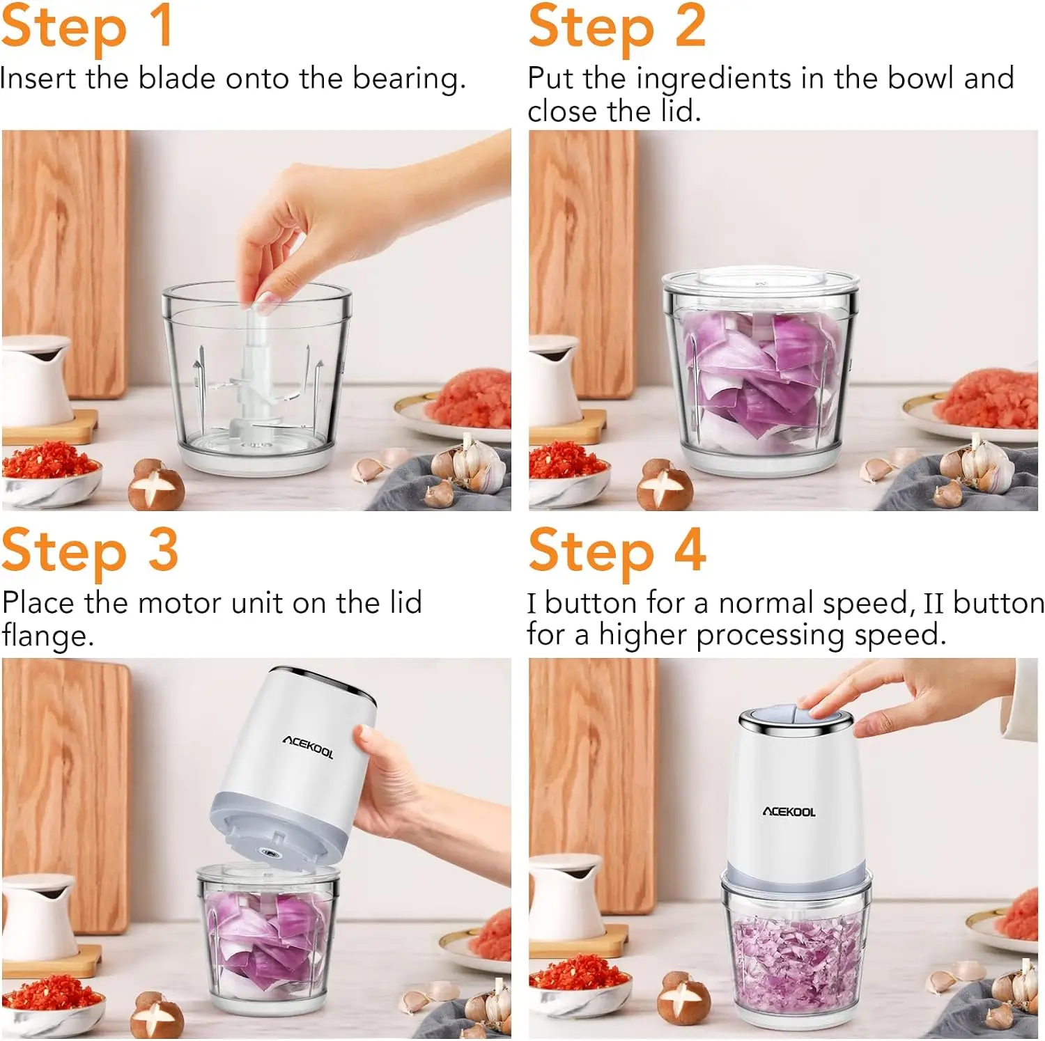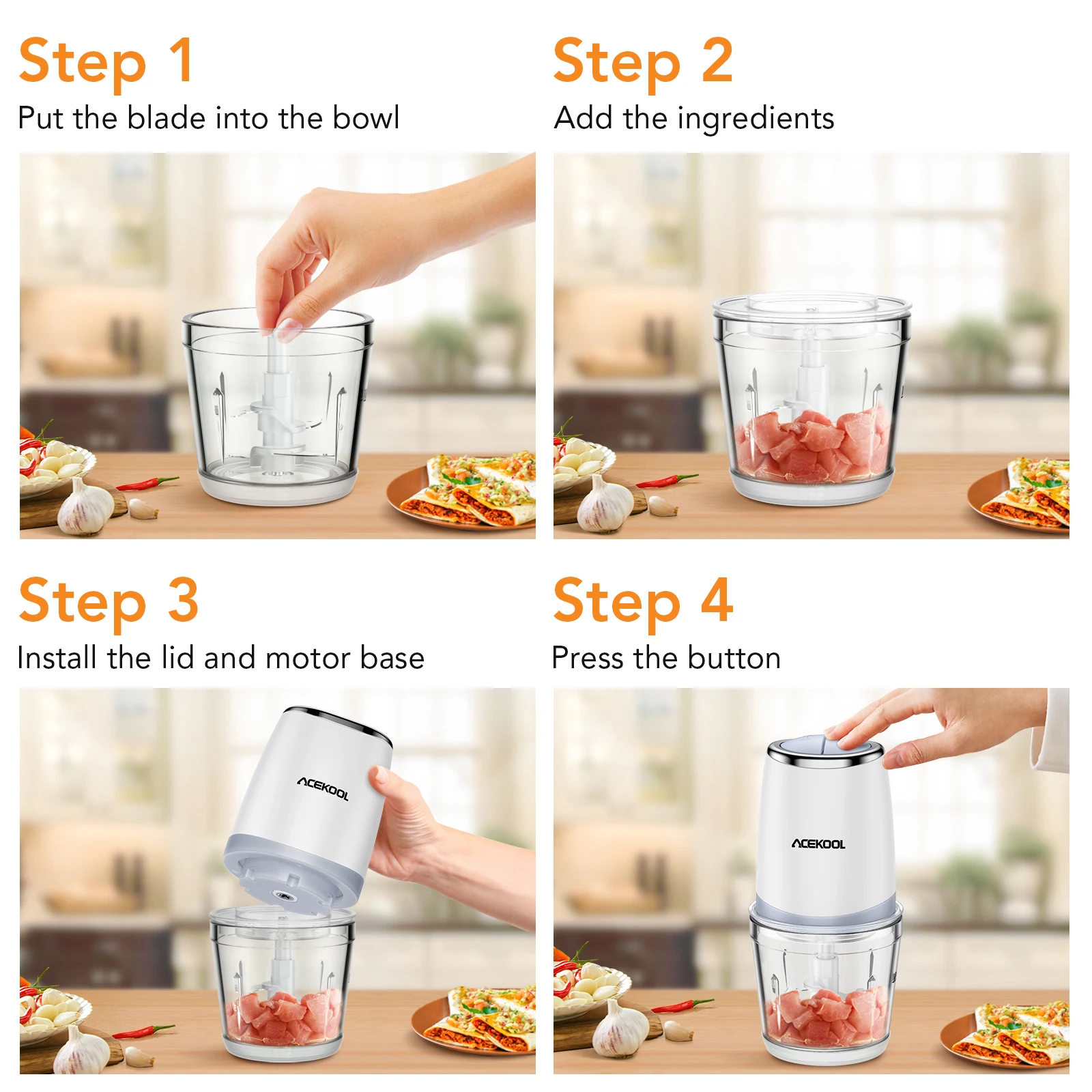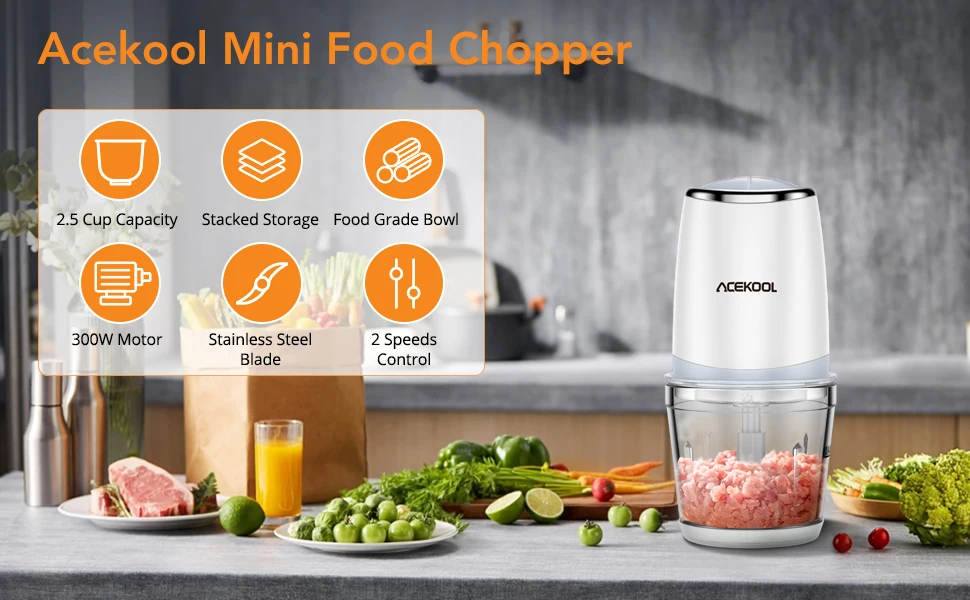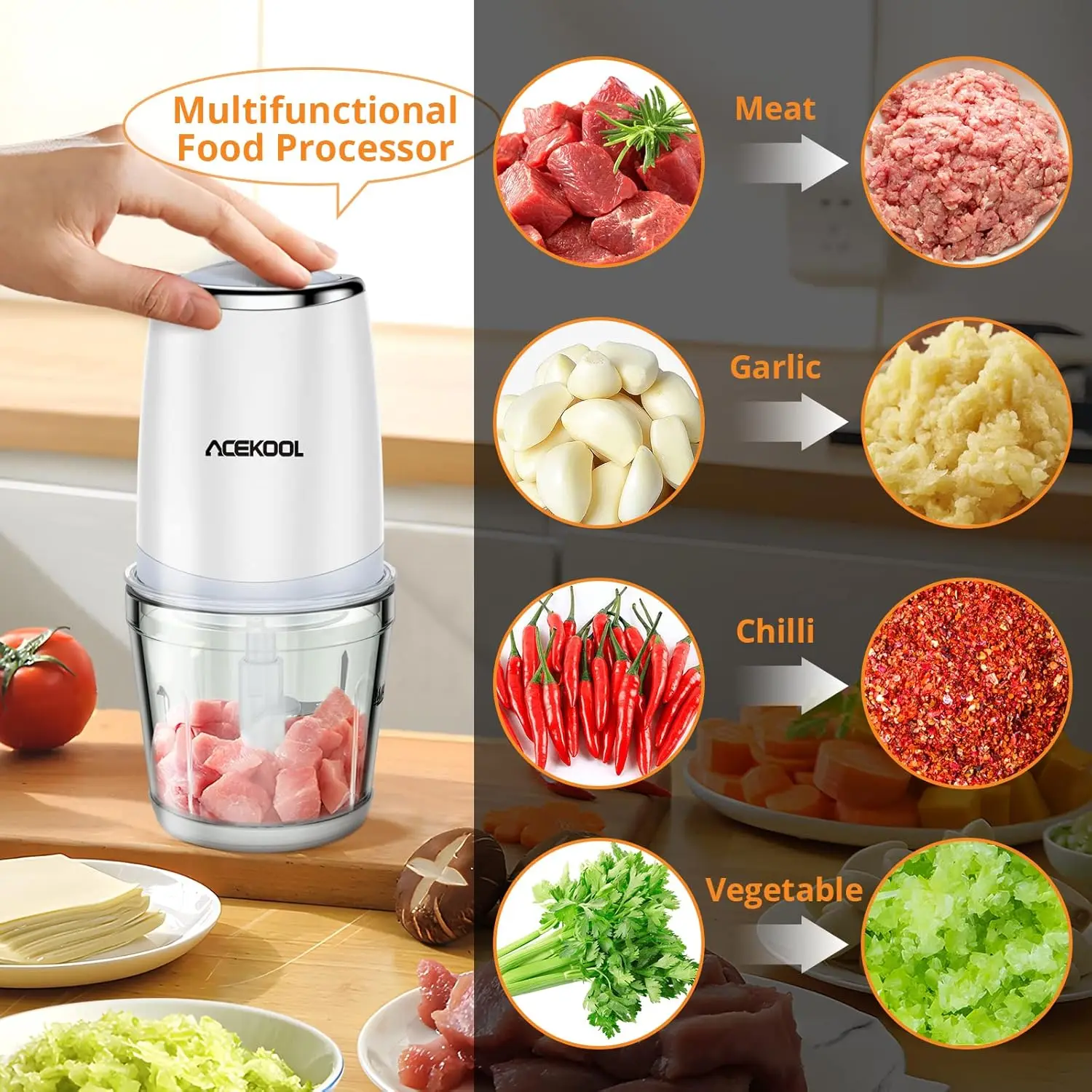🥭Food Chopper Express Chop: With the Acekool small food processors make quick work of everyday chopping, grinding, pureeing, and whisking! Chop fruits, vegetables, meat, bread, nuts, garlic, onion, mix up relishes and blend up dips and sauces. Make homemade nut butter, or grind spices and grains
