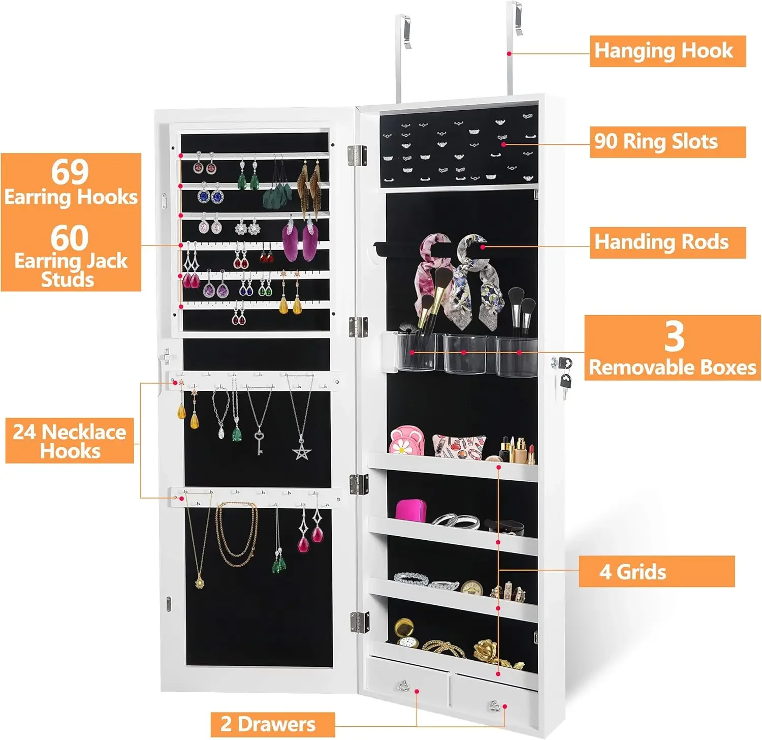 - Hanging Jewelry Cabinet — Hang the jewelry organizer over the door with equipped hooks, or mount it on the wall with screws. Space saving and convenient to storage your jewelry and make up tools.