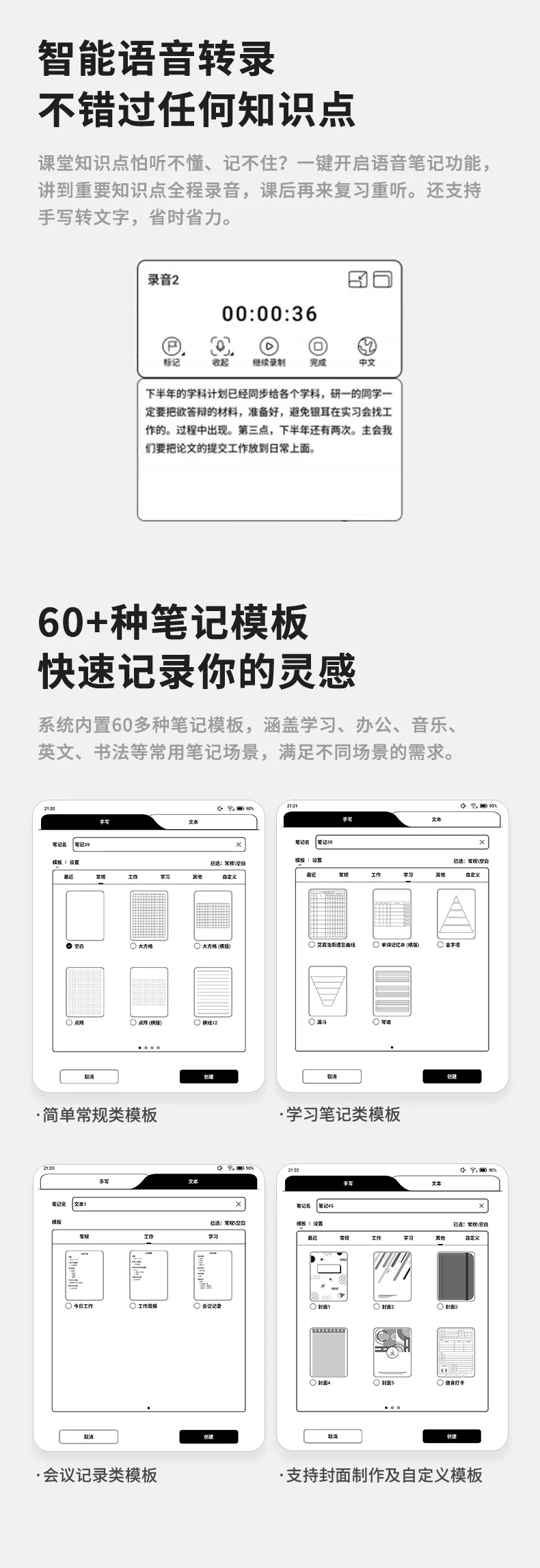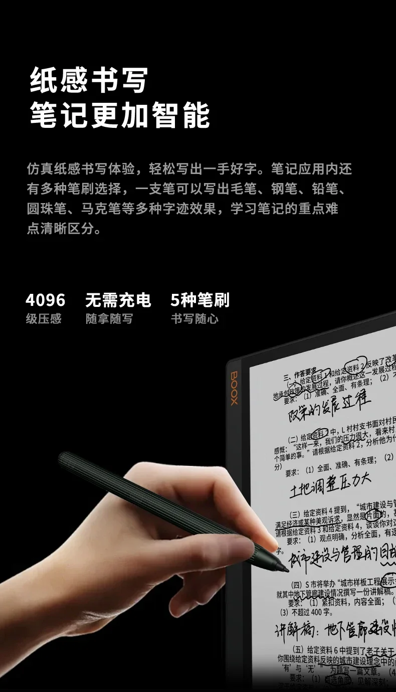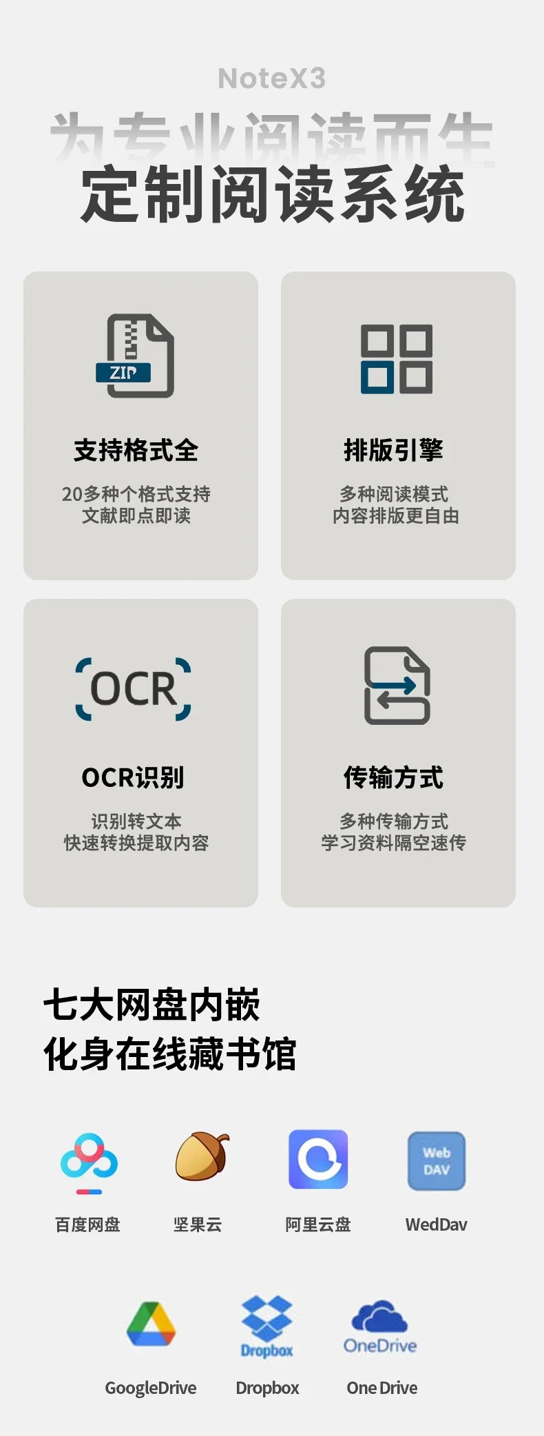 The parameters of the Aragonite NoteX3 include: 12 Screen size: 10.3 inches, resolution of 1872*1404, pixel density (PPI) of 227. Processor: Equipped with Qualcomm octa-core 2.4GHz processor, the performance is about 25% higher than the previous generation. Memory and storage: Equipped with 4GB LPDDR4X RAM and 64GB UFS2.2 storage space, supporting up to 1TB of TF card expansion. Operating system: Running Android 12.0 system. Connectivity: Supports WiFi and Bluetooth 5.0. Input method: Supports capacitive touch and electromagnetic pen handwriting. Battery life: Built-in 3700mAh battery. Screen technology: Using microcrystalline etched tempered glass, Carta1000 material, the thickness of the light guide plate is thinned by 40%, the uniformity of the front light is increased by 12%, and the transparency is as high as 92%.Other functions: integrated AI reading assistant  and AI handwriting recognition system , supports free split-screen operation, built-in 7 commonly used network disks, and has functions such as voice transcription  and handwriting to text conversion. These parameters show that the Onyx NoteX3 is a powerful and feature-rich e-reading device.