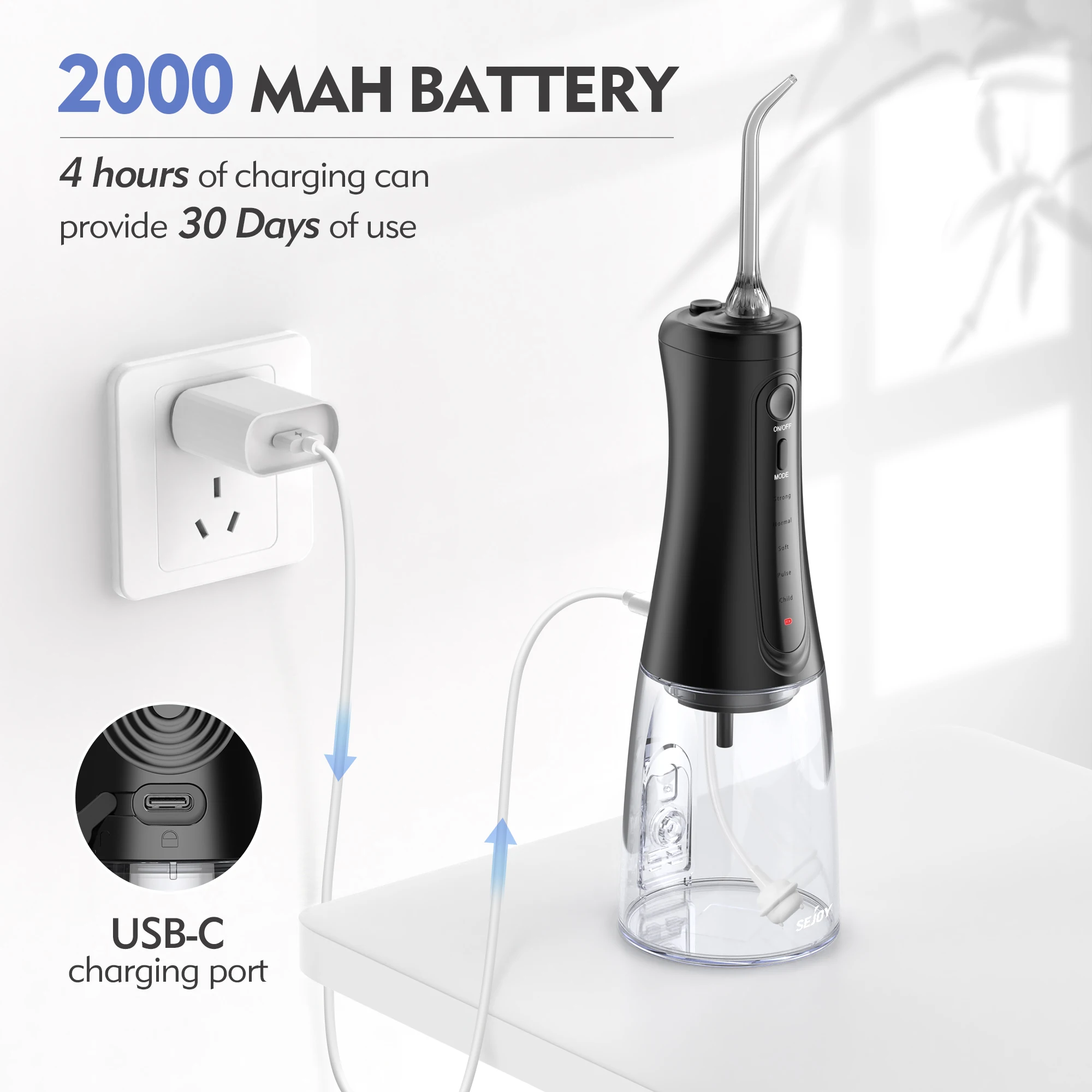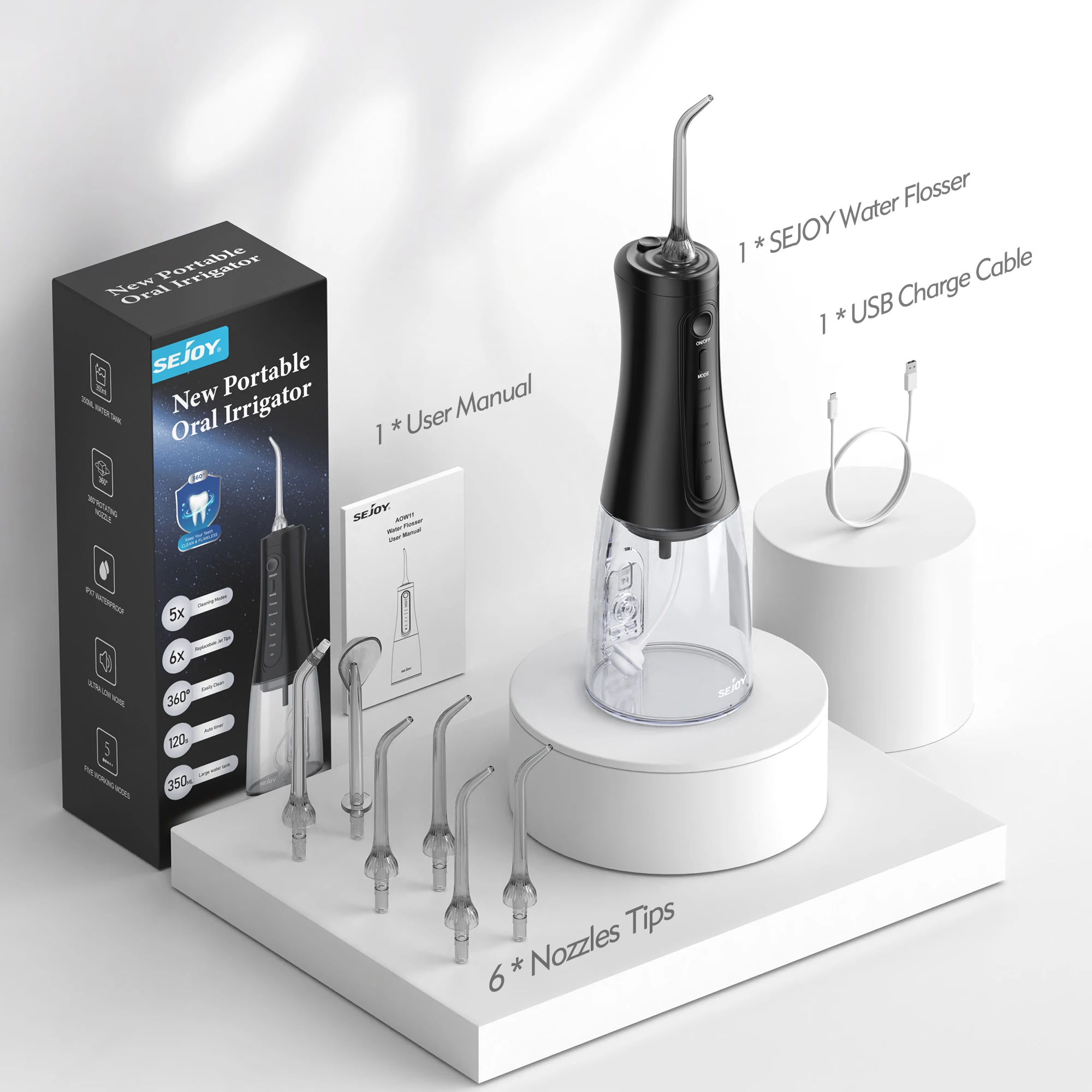 4.350ML Detachable Water Tank & 7 PCS 360 ° Rotatable Water Jet Tip.