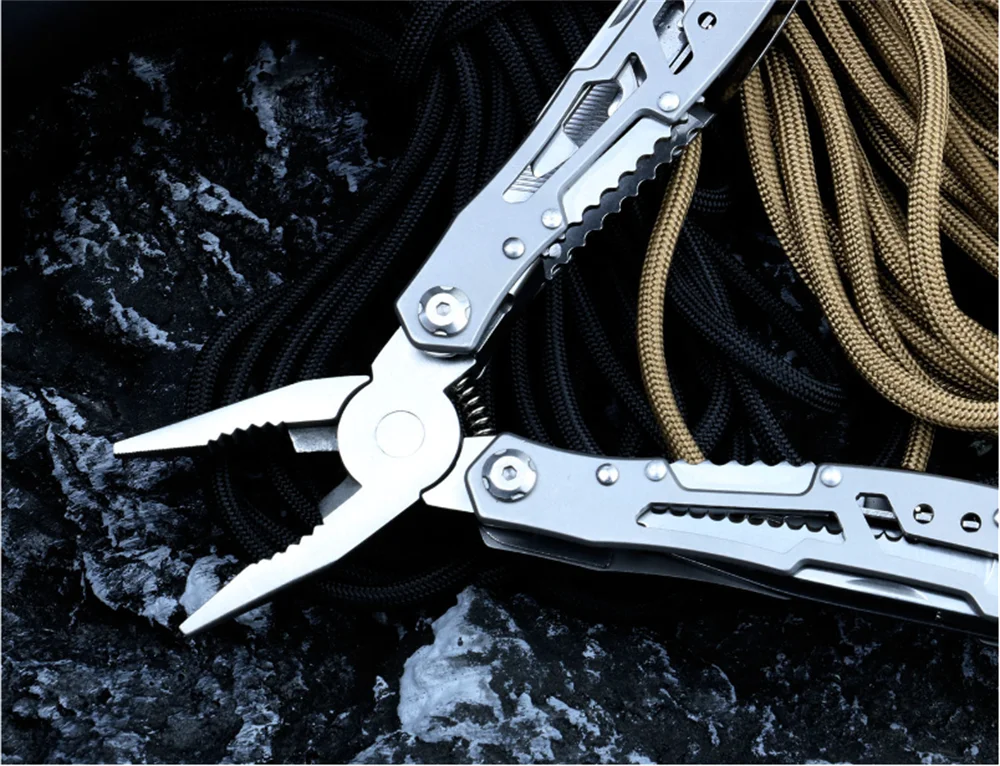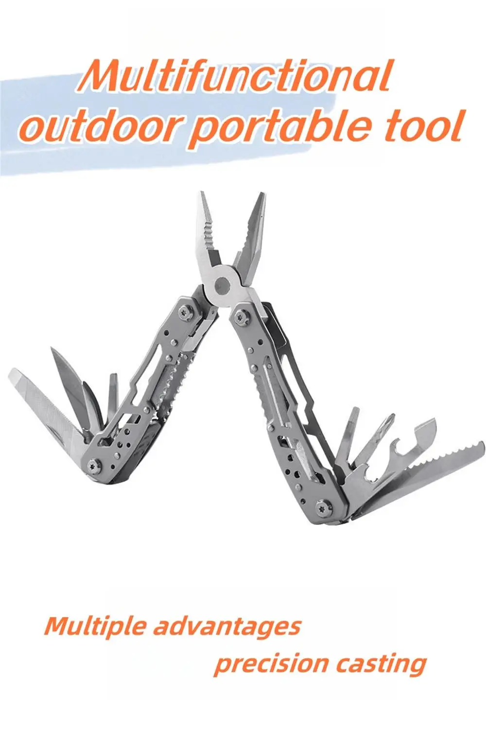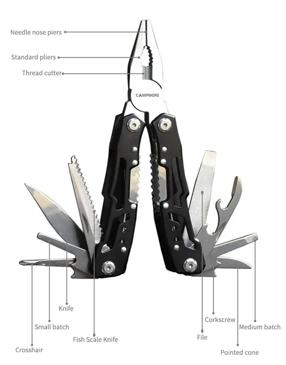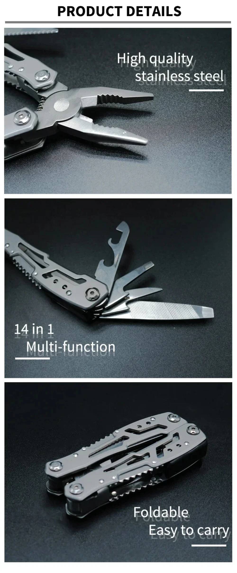 14-in-1 function: 1. Pliers head (needle-nose pliers, round pipe pliers, pliers) 2. Knife 3. Phillips screwdriver 4. Small flat-blade screwdriver 5. Fish scale tooth knife 6. Dehooker 7. Double-sided file 8. Large flat-blade screwdriver 9. Small scraper 10. Medium flat-blade screwdriver 11. Can opener 12. Bottle opener
