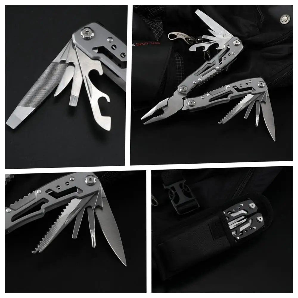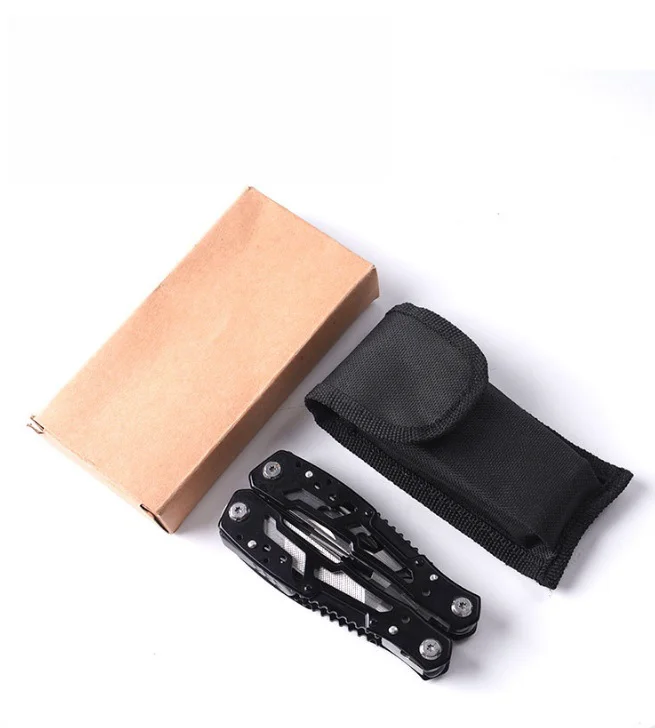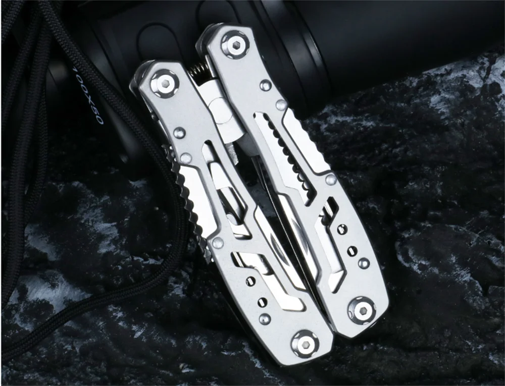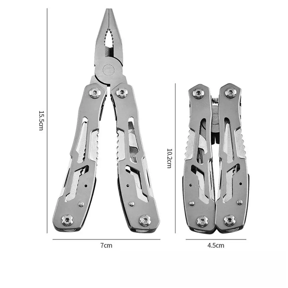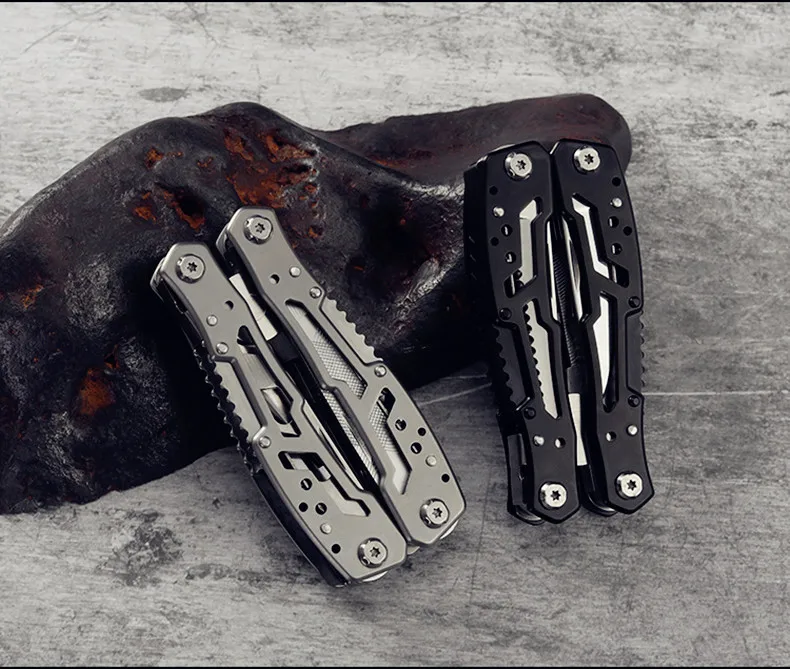 14-in-1 function: 1. Pliers head (needle-nose pliers, round pipe pliers, pliers) 2. Knife 3. Phillips screwdriver 4. Small flat-blade screwdriver 5. Fish scale tooth knife 6. Dehooker 7. Double-sided file 8. Large flat-blade screwdriver 9. Small scraper 10. Medium flat-blade screwdriver 11. Can opener 12. Bottle opener