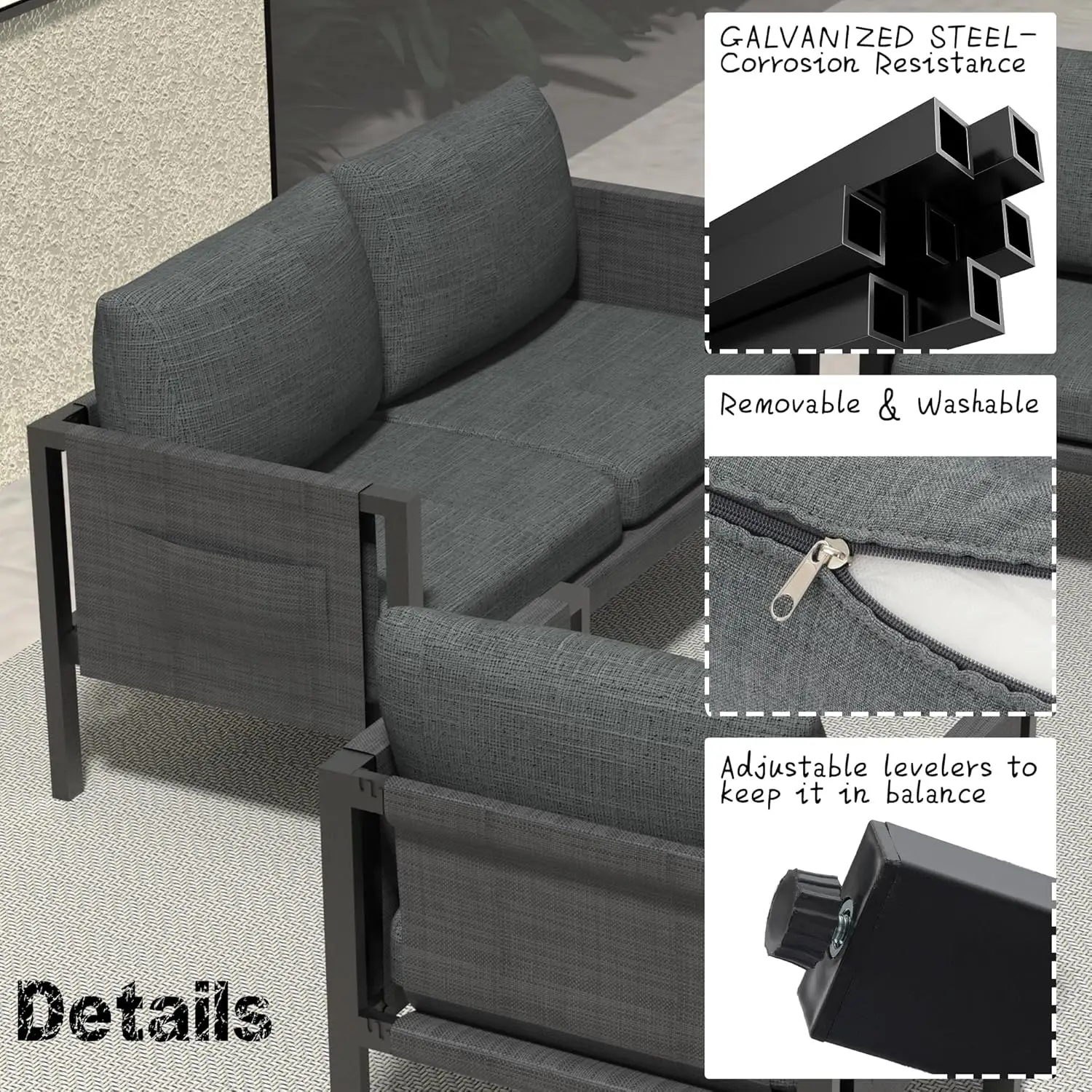 • 🌷Rust-Proof Aluminum Frame: Metal patio furniture is made of high-quality aluminum, ensures that the furniture is stable and corrosion-resistant for long-lasting use. The innovative addition of leveling screws on the bottom of each chair. This feature enables you to manually adjust the balance, despite the uneven surface of your patio.