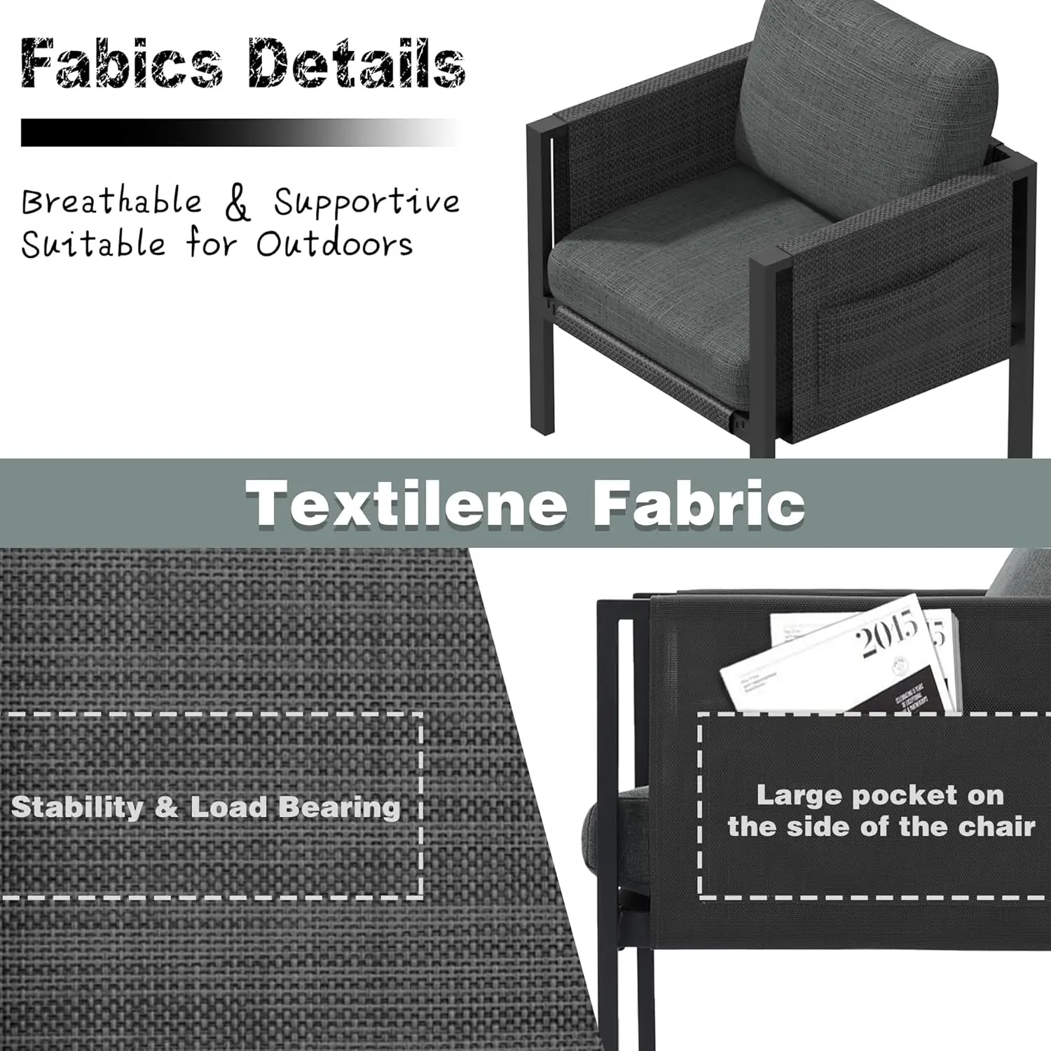 • 🌷Sturdy base supported by Textilene: Our Outdoor Patio Furniture Set experience unparalleled stability with a base supported by robust Teslin fabric. Resistant to water, oil, UV rays, and wear and tear, this fabric ensures a strong weight-bearing capacity.