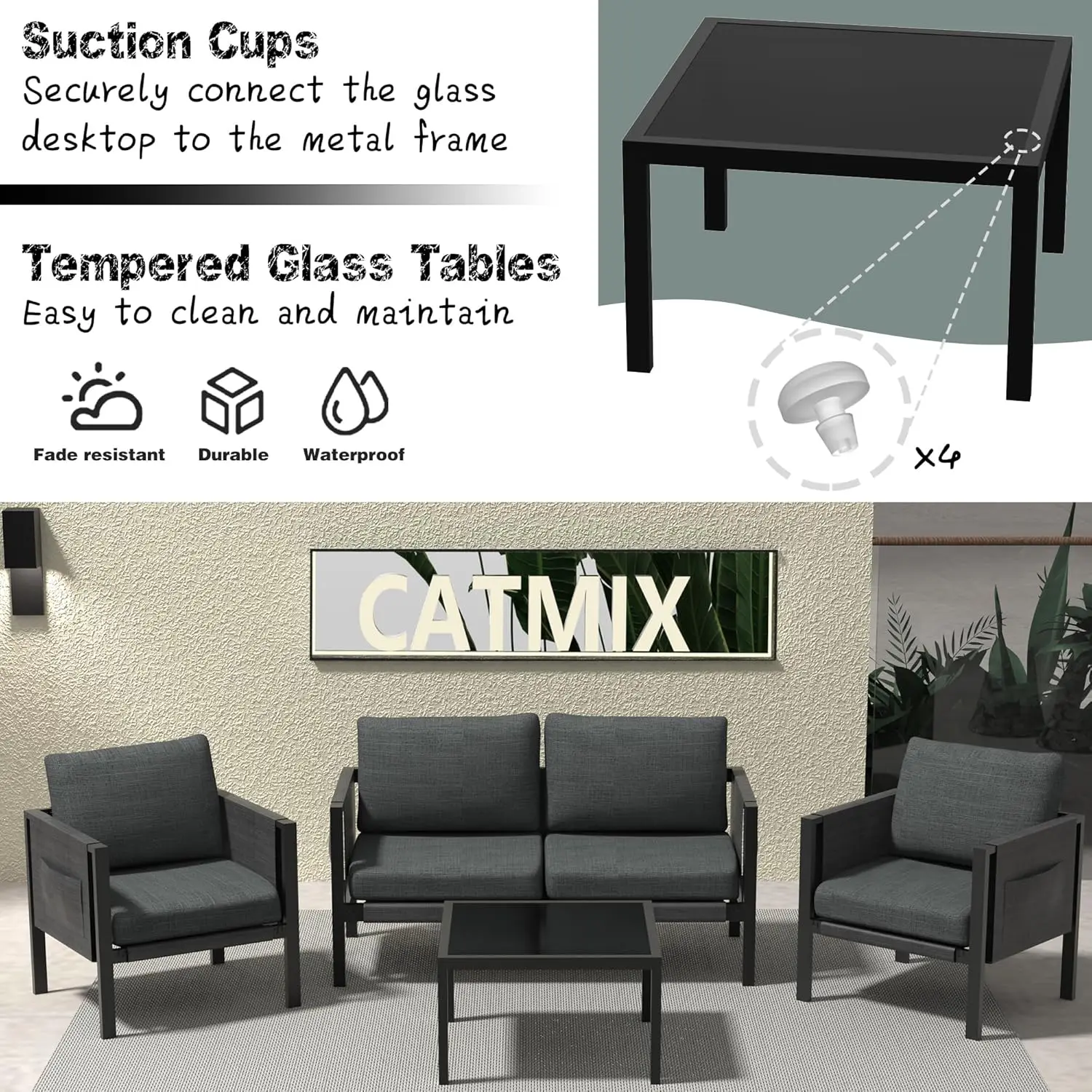 • 🌷4-Piece Patio Set Modern Charm: Whether it’s your backyard, lawn, garden, poolside, or favorite hangout spot, our patio set is designed to be a wow-factor addition. The chic and contemporary style, coupled with a tempered glass tabletop enhances your outdoor dining or lounging experience. The tabletop is cleverly equipped with suction cups to hold the glass firmly in place.