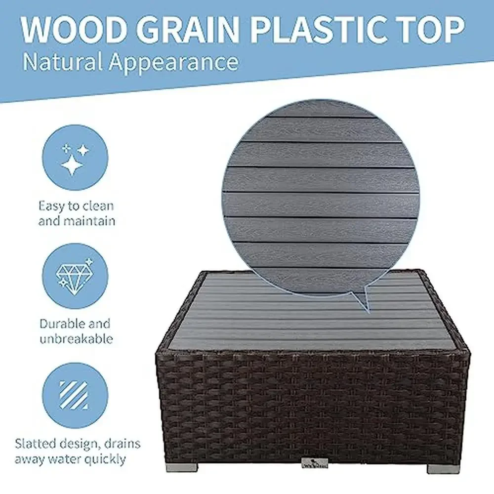 Enhance your outdoor couch set with our stylish center tea table. It has a wood grain plastic top and offers water resistance, natural beauty—the perfect size for drinks, snacks, or more.