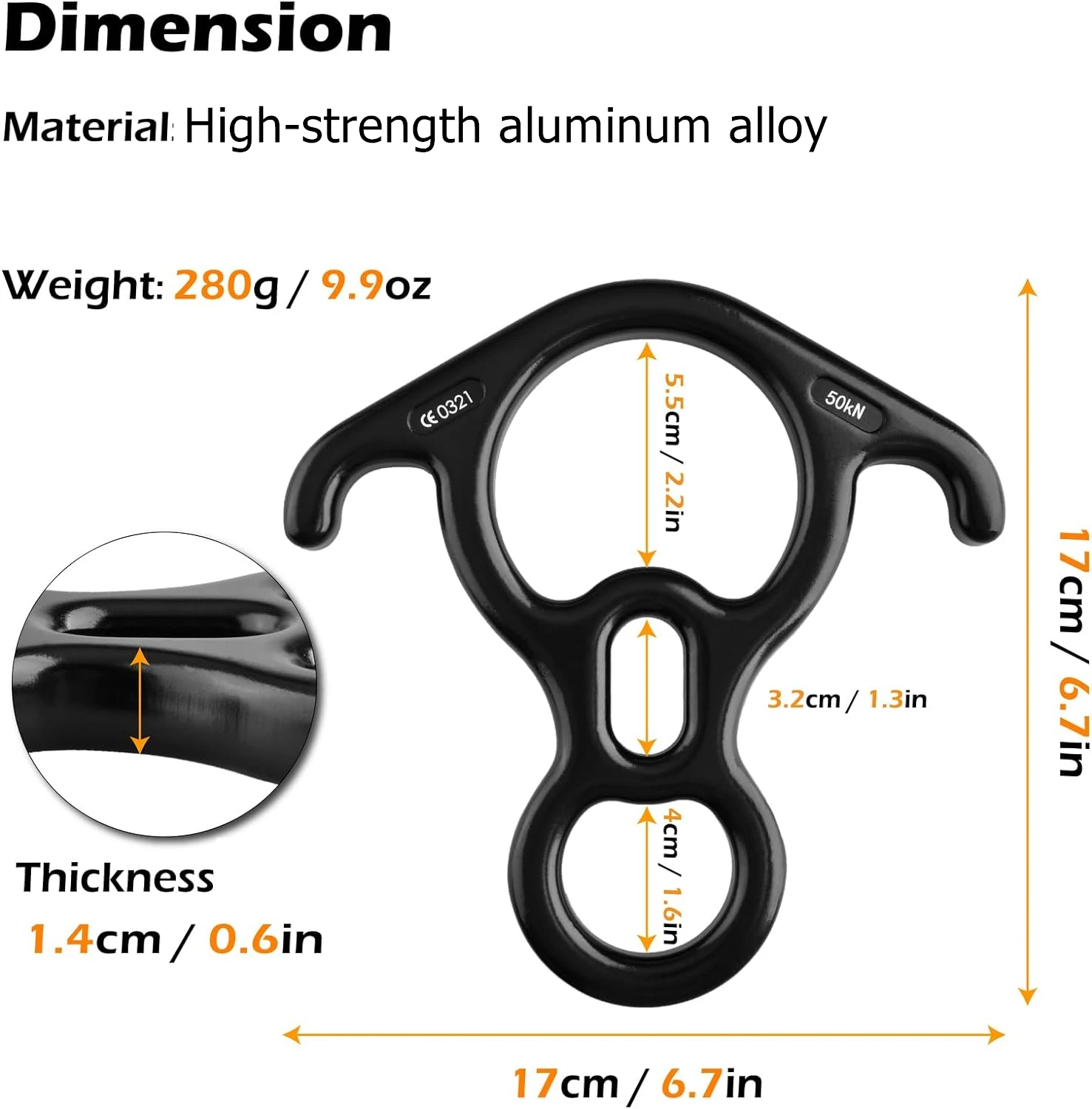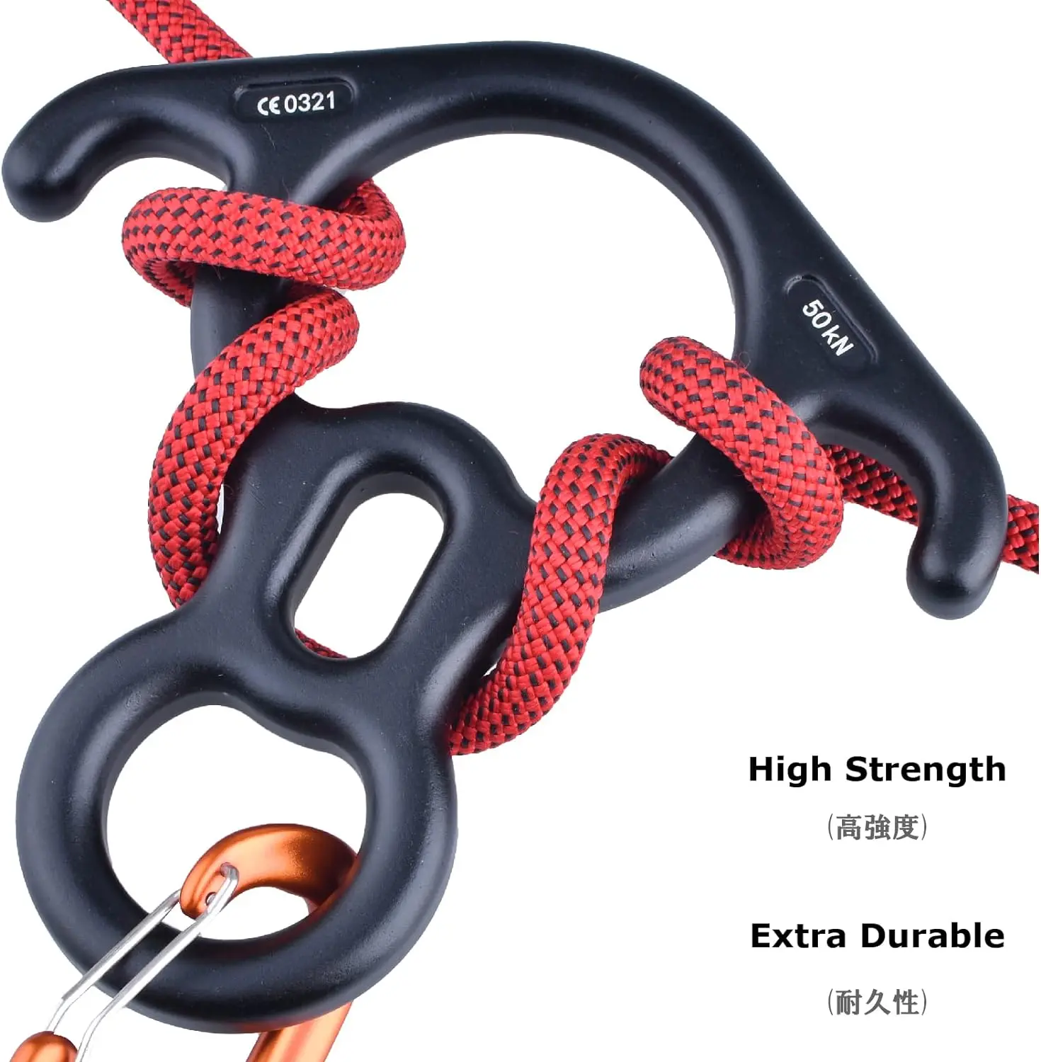 The 8-shaped Descender Large Bent-Ear Belaying has excellent braking resistance and a breaking strength of 11000 LBF (50kN / 5000kg).