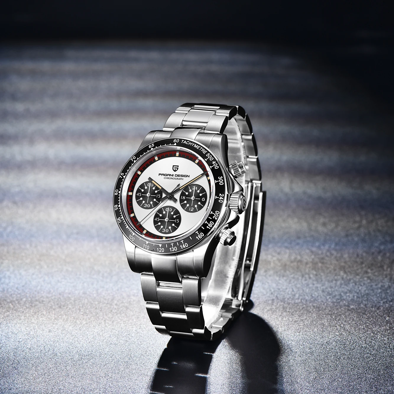 ●Stainless steel bracelet with folding clasp, 39mm stainless steel case, Black ceramic bezel and 100m water resistance, coin-shaped scratch-resistant sapphire crystal glass, Panda dial,