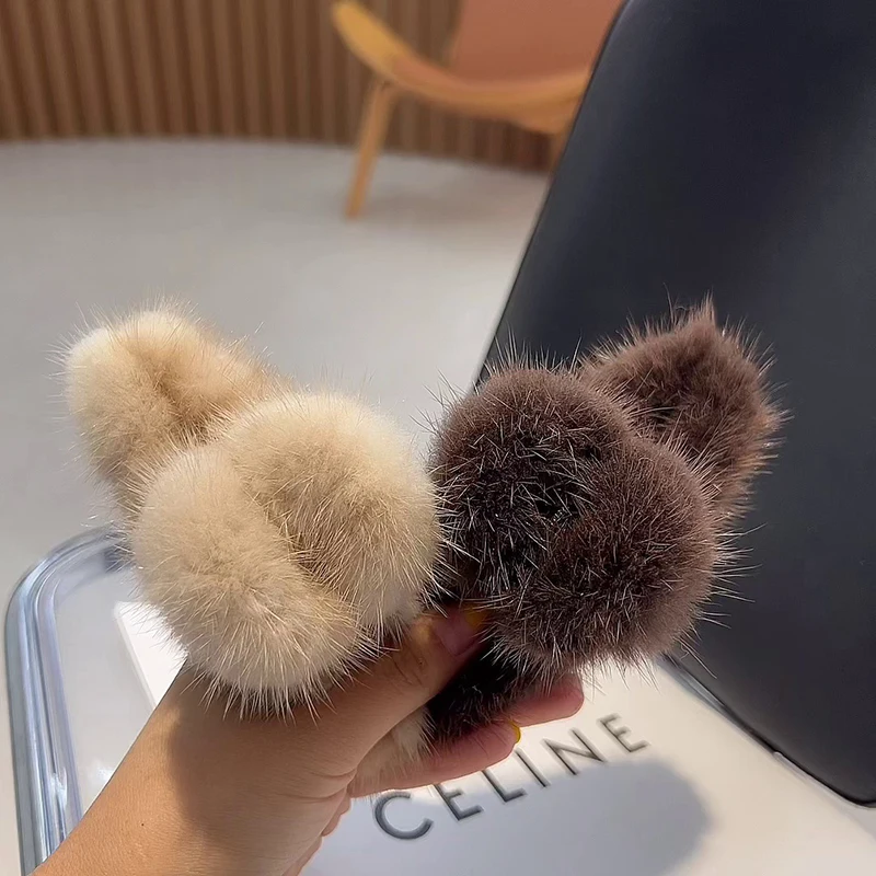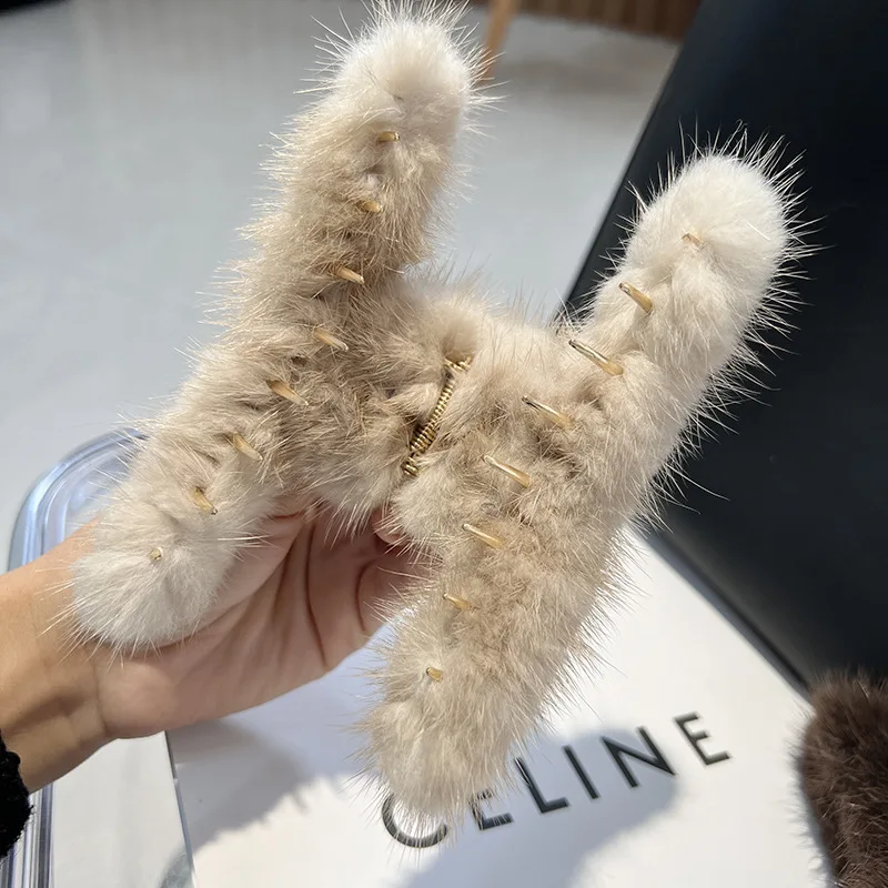 Real Mink Fur Barrettes Winter Fluffy Hair Claw Elegant Acrylic Hairpins Clip Crab Headwear for Women Girls Hair Accessories
