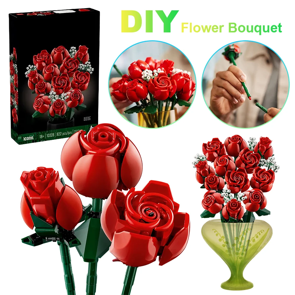 Assembled Flower Bouquet Ornament 10280 Flower Bouquet Building Blocks Kit Valentine Day Rose Bricks Set for Girls Birthday Gift