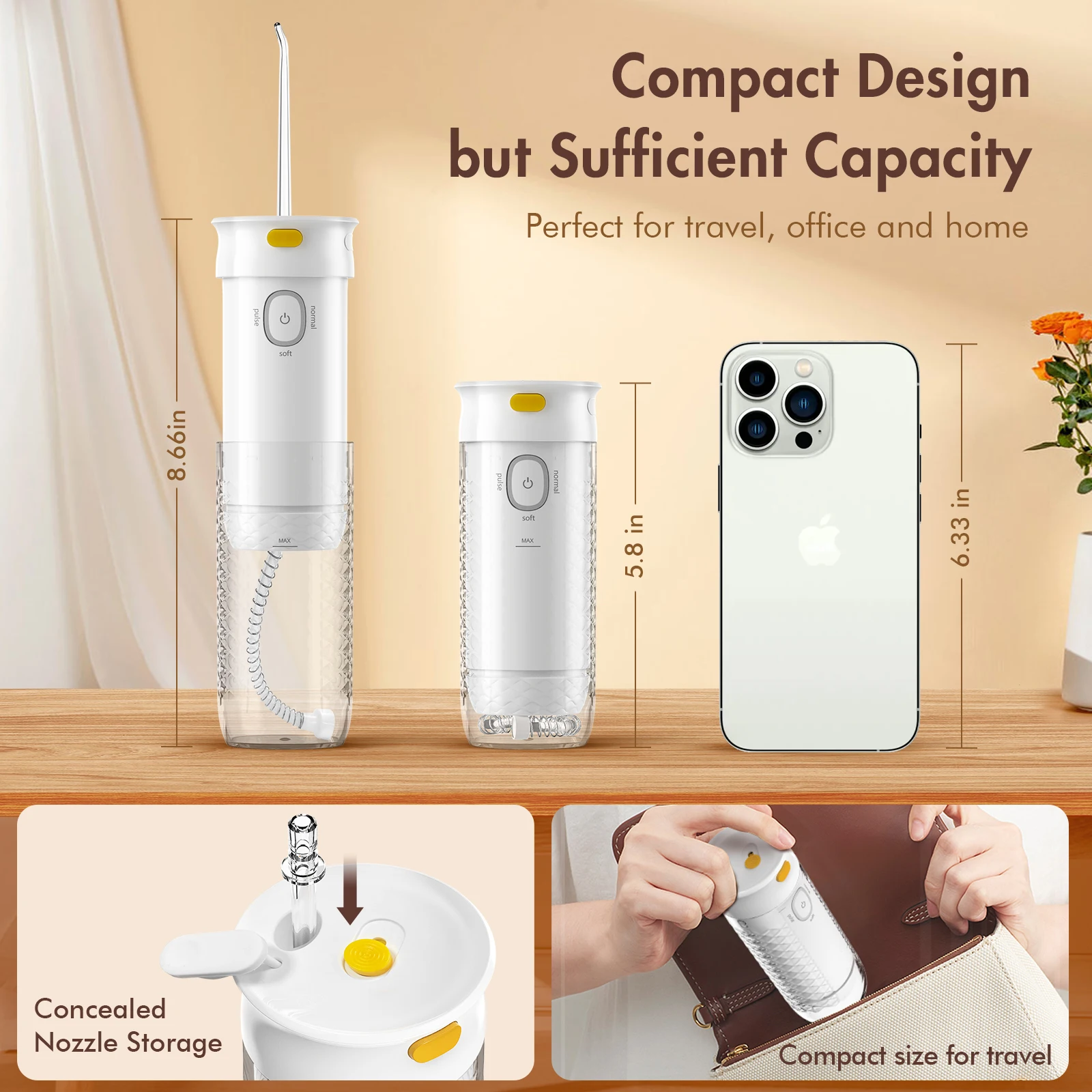 Product Name:Portable Dental Water Flosser Product Number:CYQ-MINT3 .3 Cleaning Modes .USB Charging Port .Powerful pulsing water flow .large capacity water