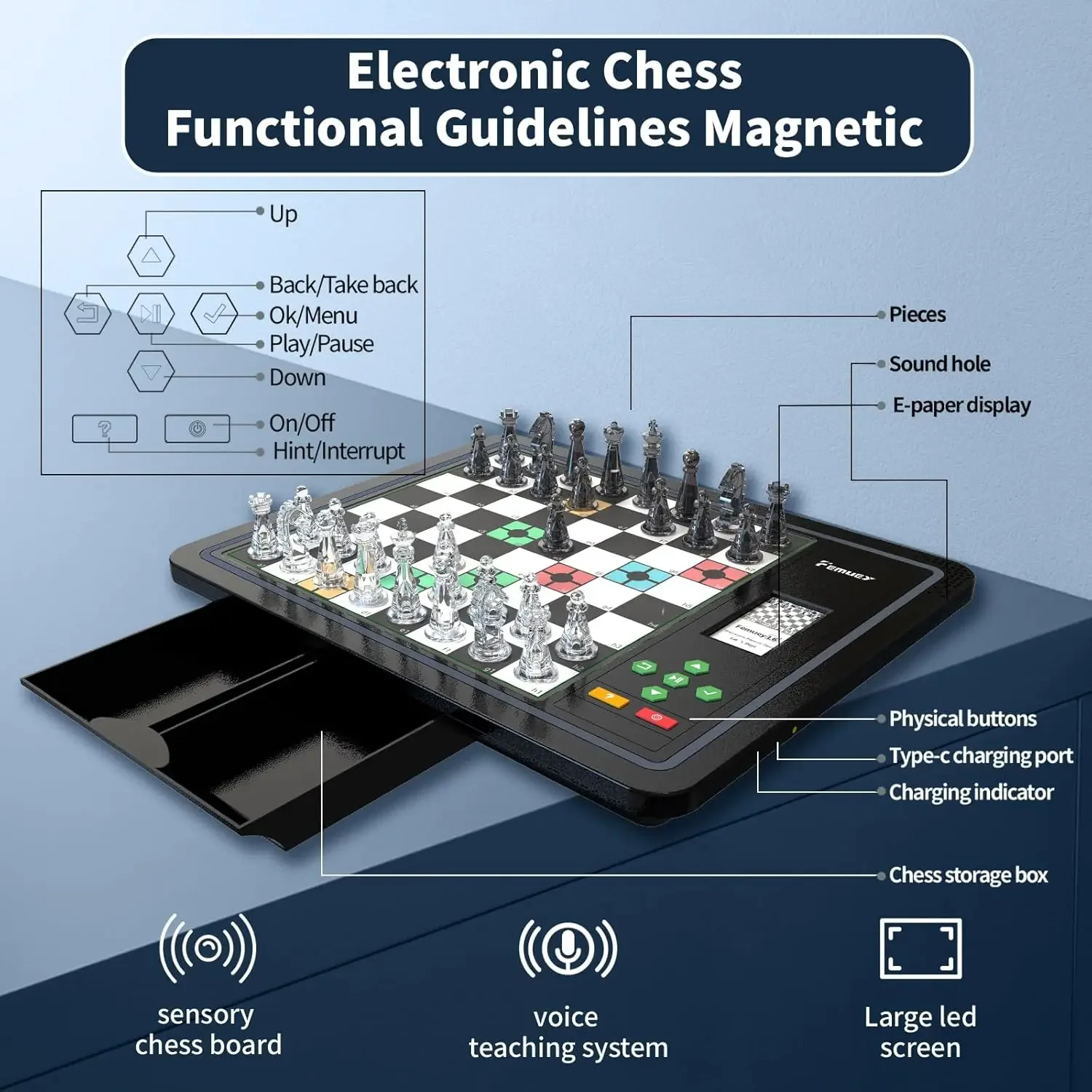 Chess Set Board Game : Chess Coach innovative and fun addition to your home and game night.Package contains: Electronic chess, 34 pieces, charging cable, manual(Including built-in rechargeable lithium battery).