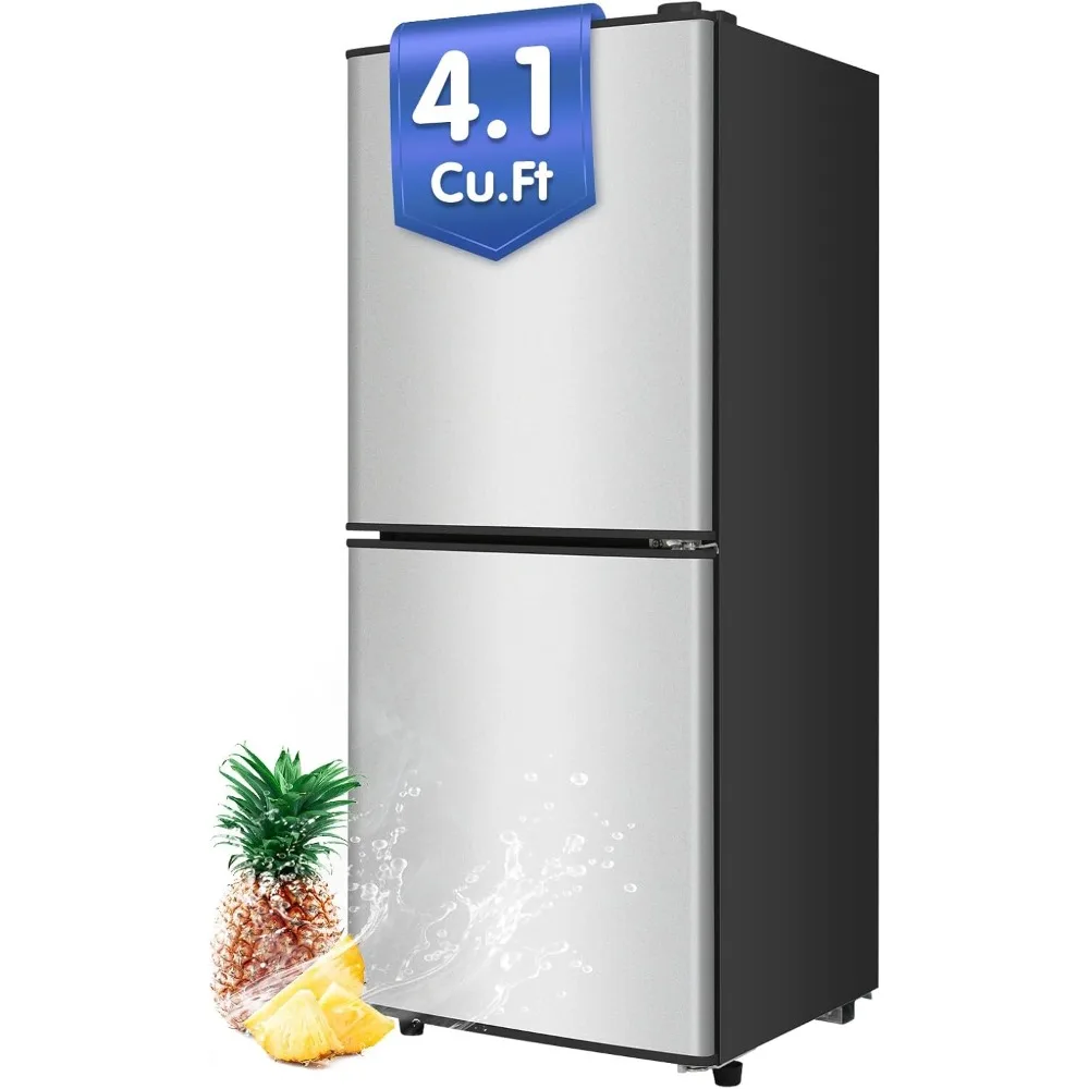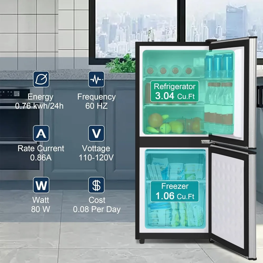 🧊 Efficient internal compartments: this mini fridge features a separate 1.06 Cu. Ft. freezer 3.04 Cu. Ft. and a cooler, combining two functions into one for expanded storage space. The upper level is a freezer compartment that allows ice cream, pizza, and ice cube lights to be completely frozen. The lower freezer space keeps vegetables and fruits fit to stay fresh.