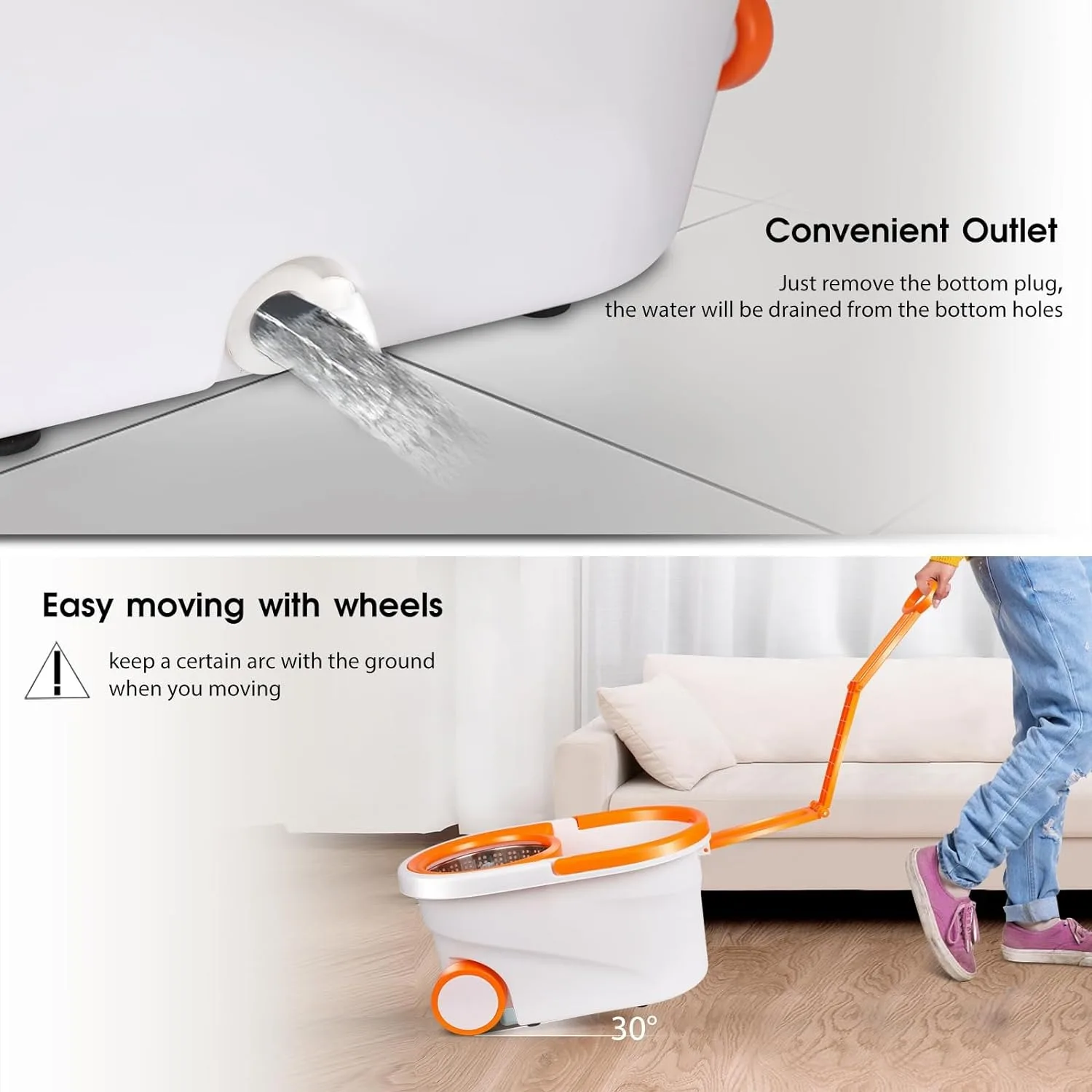 • Different Cleaning Experience: MASTERTOP spin mop bucket has two wheels, one pull handle and one carry handle. It’s easy moving while cleaning, it brings extra comfort for the disabled and those who cannot bear heavy weight. In addition, there has a drainage plug for draining water, a soap dispenser for adding detergent.