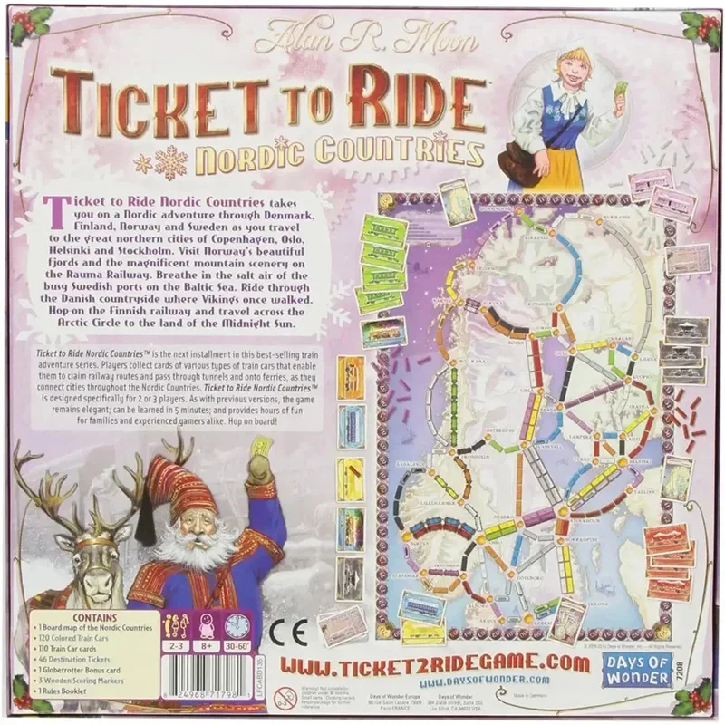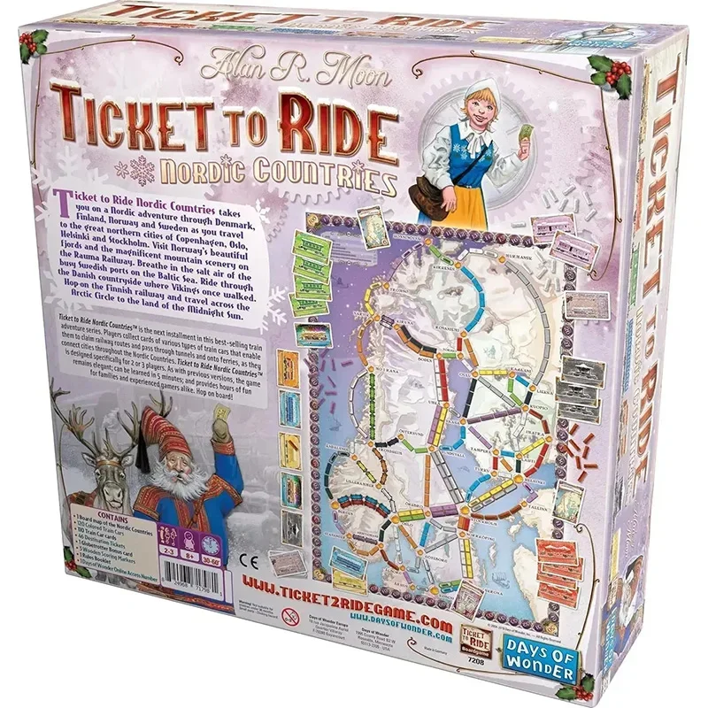 Ticket to Ride Nordic countries takes you on a Nordic adventure through Denmark, Finland, Norway and Sweden as you travel to the great northern cities of Copenhagen, Oslo, Helsinki and Stockholm. Visit Norway’s beautiful fjords and the magnificent mountain scenery on the trauma railway. Breathe in the salt air of the busy Swedish ports on the Baltic Sea. Ride through the Danish countryside where Vikings once walked. Hop-on the Finnish railway and travel across the Arctic Circle to the land of the midnight sun. Players collect cards of various types of train cars that enable them to claim railway routes and pass through tunnels and onto ferries, as they connect cities throughout the Nordic countries. as with previous versions, the game remains elegant, can be learned in 5 minutes and provides hours of fun for families and experienced gamers alike. Ticket to ride Nordic countries is a complete board game designed specifically for 2 or 3 players. The box contains: a full-size board map of Nordic countries, 135 colored train cars, 110 train car cards, 46 destination tickets, 1 globetrotter bonus card, 3 wooden scoring markers, 1 rules booklet, and 1 days of wonder online access number.