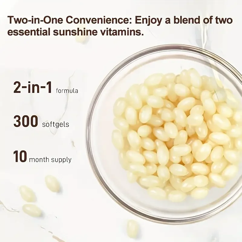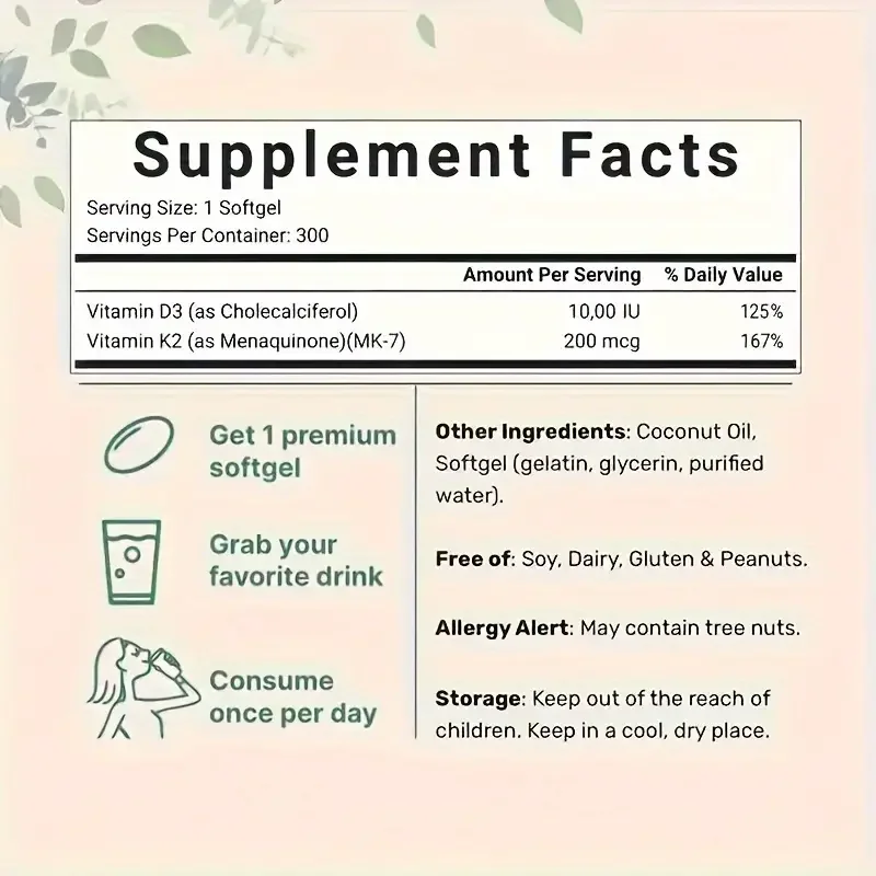 • Each pouch offers 300 easy to consume mini coconut oil infused softgels. A potent one a day complex that provides natural sunshine vitamin synergy. 10,000 iu Vitamin D3 and 200 mcg vitamin K2 per dose.