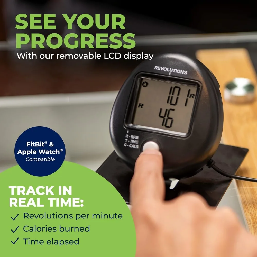 - EASY TO USE: Large 6-Function LCD display tracks revolutions, RPM, time, calories burned and more. For easy reading, remove the display from under the desk and set it up on your table with the included display stand.