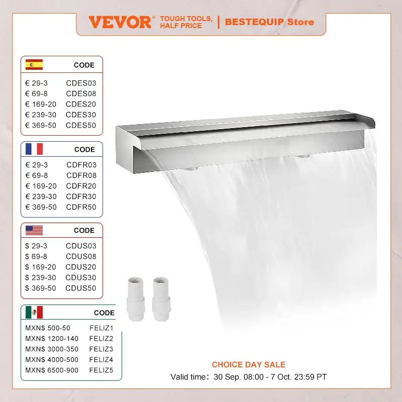 VEVOR Waterfall Pool Fountain Stainless Steel W/ Pipe Connector Spillway Garden Outdoor Pond Rectangular Swimming Pool Fountain
