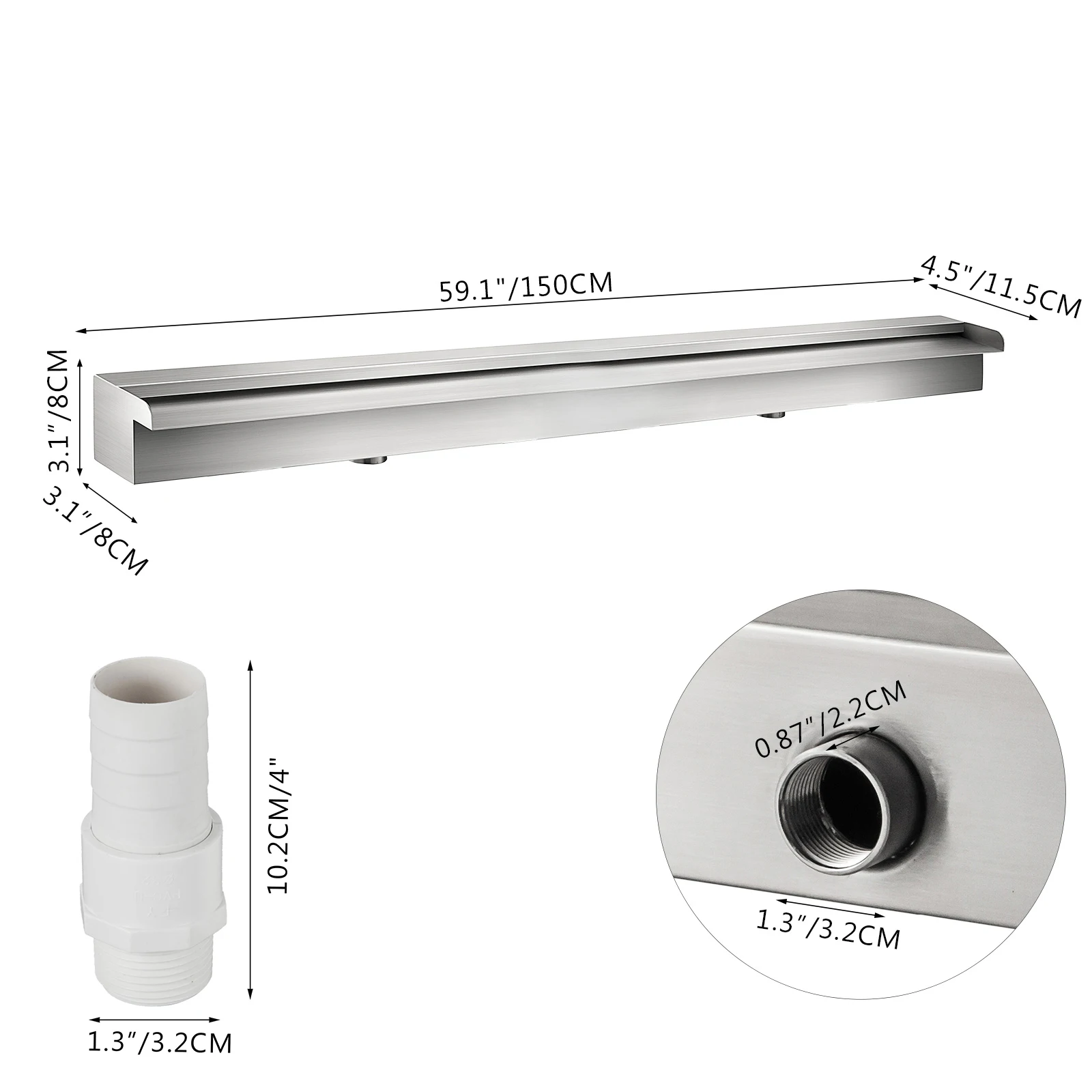 Stainless Steel Pool Fountain 23.6 in & Sturdy and Corrosion-proof & A Connector Included This stainless steel waterfall spillway is sturdy, modern, and corrosion-proof and provides invigorating and elegant water flows. You can enjoy the sights and sounds of falling water to feel the nature vibe and get stress relief and relaxation. It is ideal for adding a unique aesthetic to your yard or garden. You can enjoy the sights and sounds of falling water to feel a sense of connection with nature, no matter where you are.