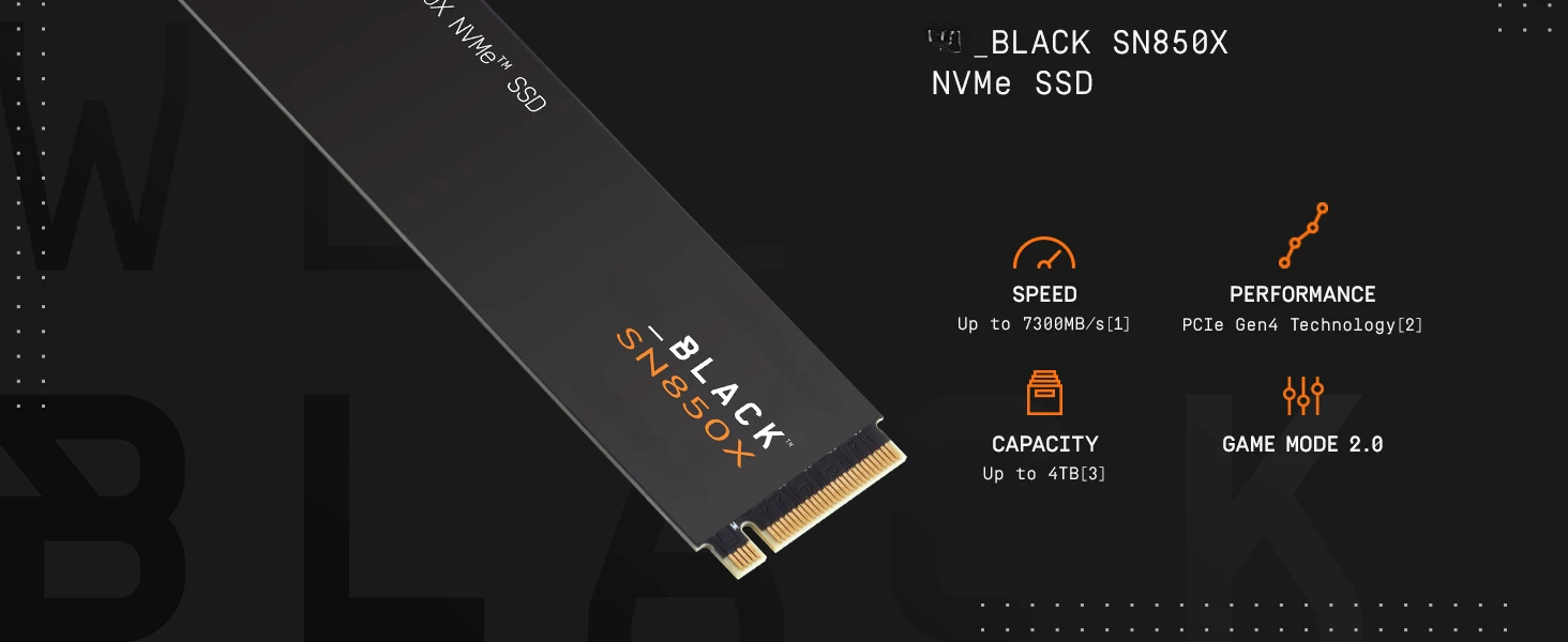 Strap in for breakneck gaming speeds with the _BLACK SN850X NVMe™ SSD. Crush load times and slash throttling, lagging, and model pop-ins for a smooth, fast experience that lets you compete at your absolute peak. This purpose-built gaming drive comes in capacities of 1TB to 4TB. With the advanced features of Game Mode 2.0 (Windows® only) plus speeds that approach the limits of the PCIe® Gen4 interface, the _BLACK SN850X NVMe SSD delivers top-tier performance to keep you playing, streaming, recording, and dominating the game.
