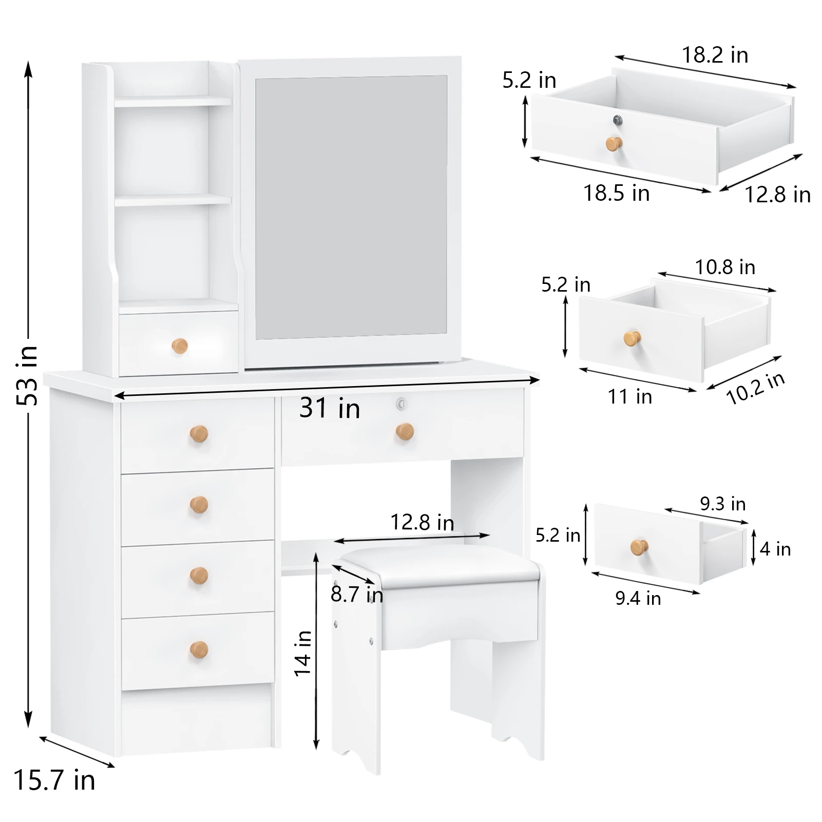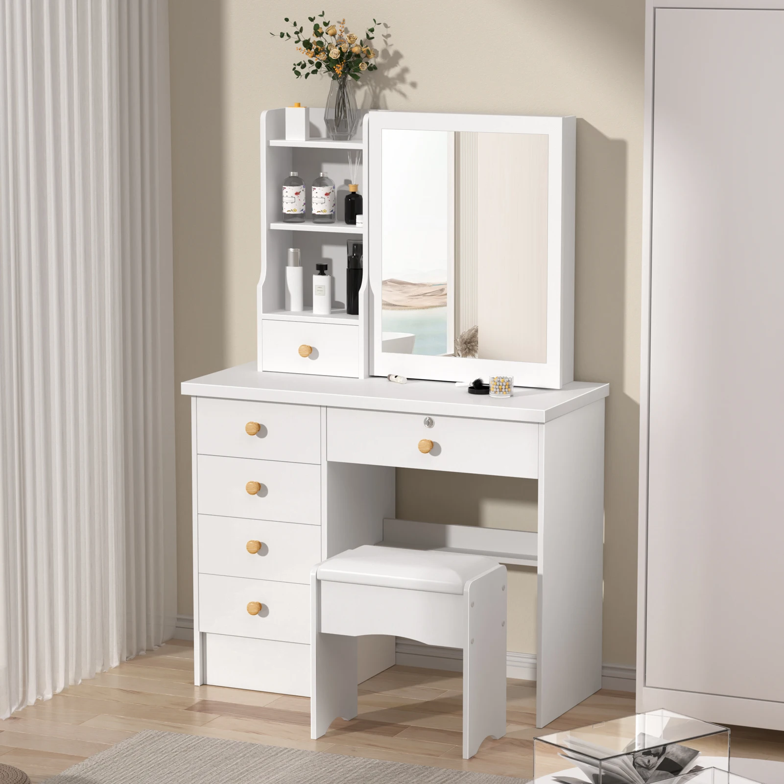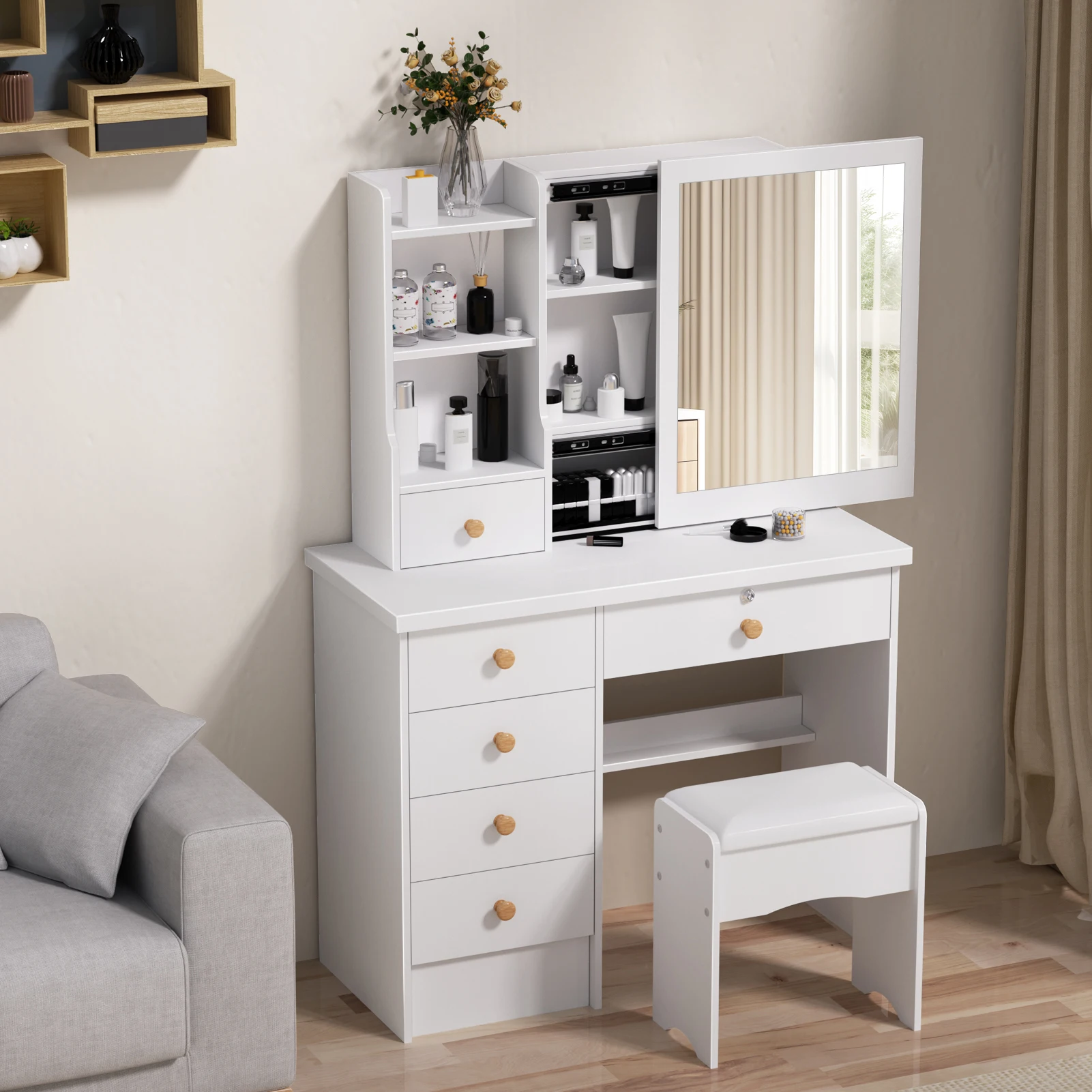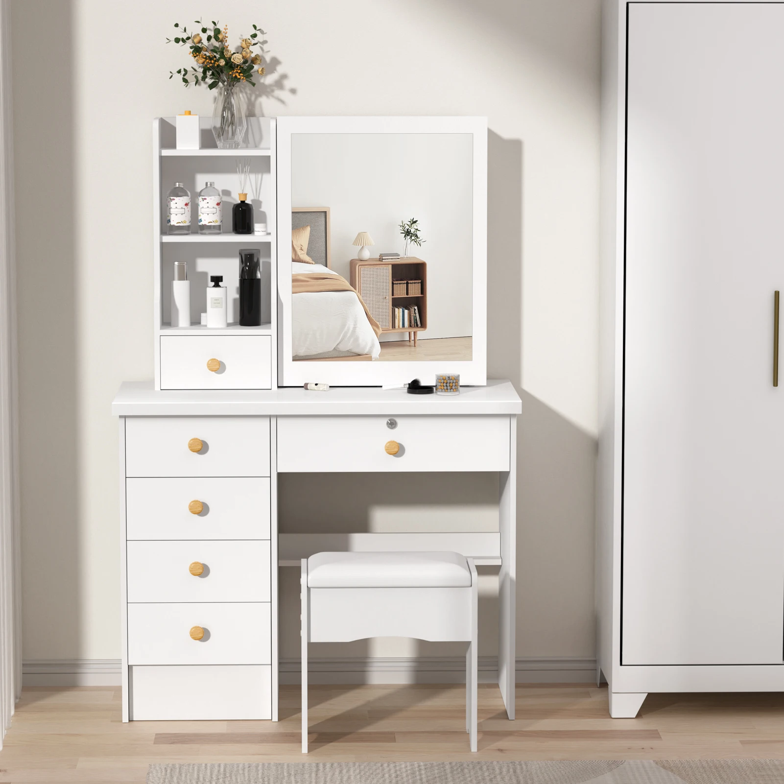 White Vanity Set With Sliding Mirror Bedroom Furniture Home Makeup Vanity Table Girls Furnitures With 6 Drawers Storage Space